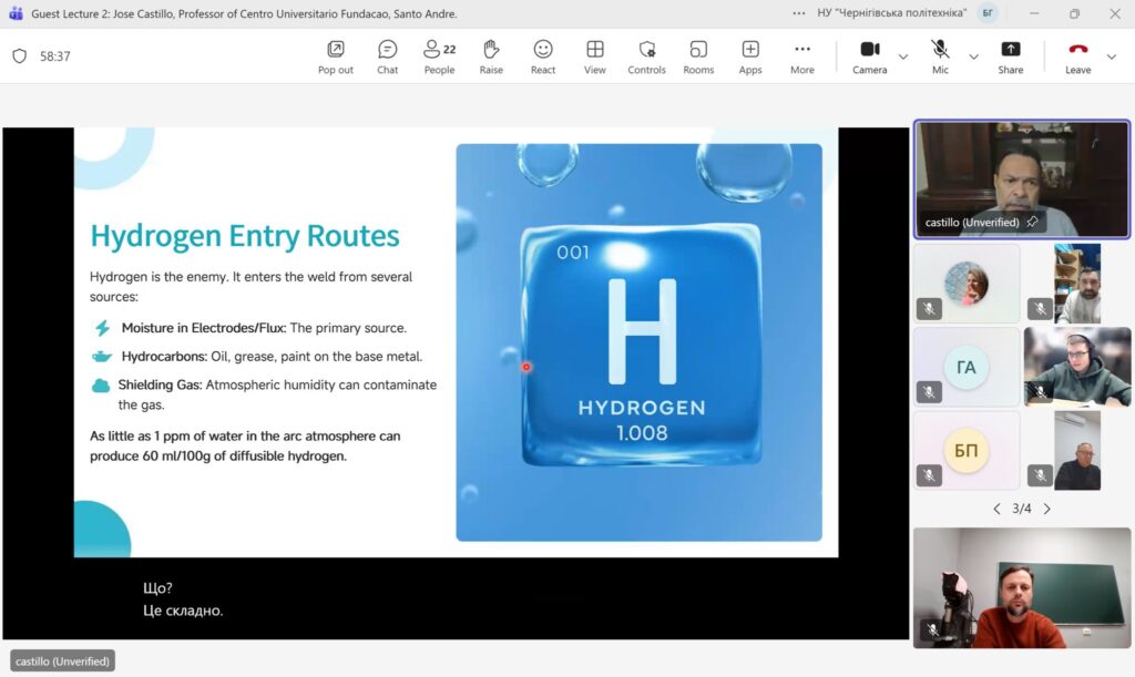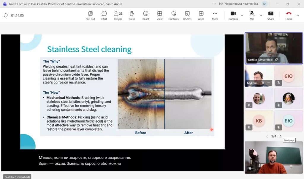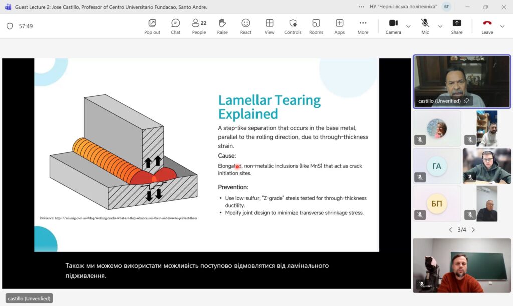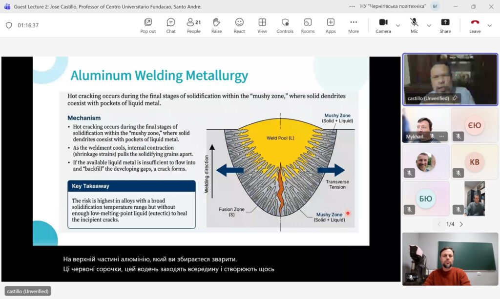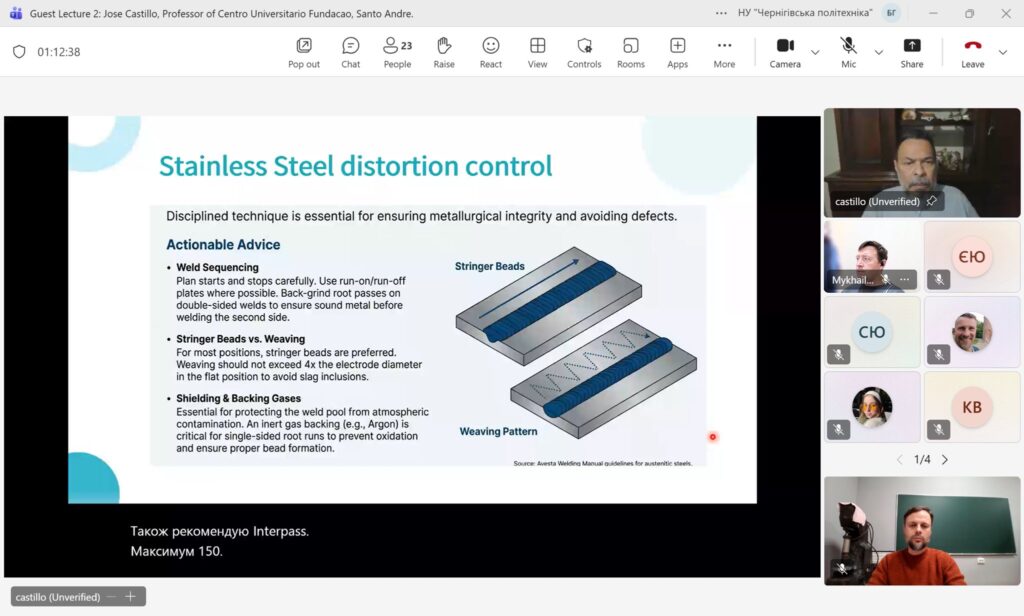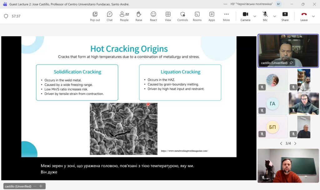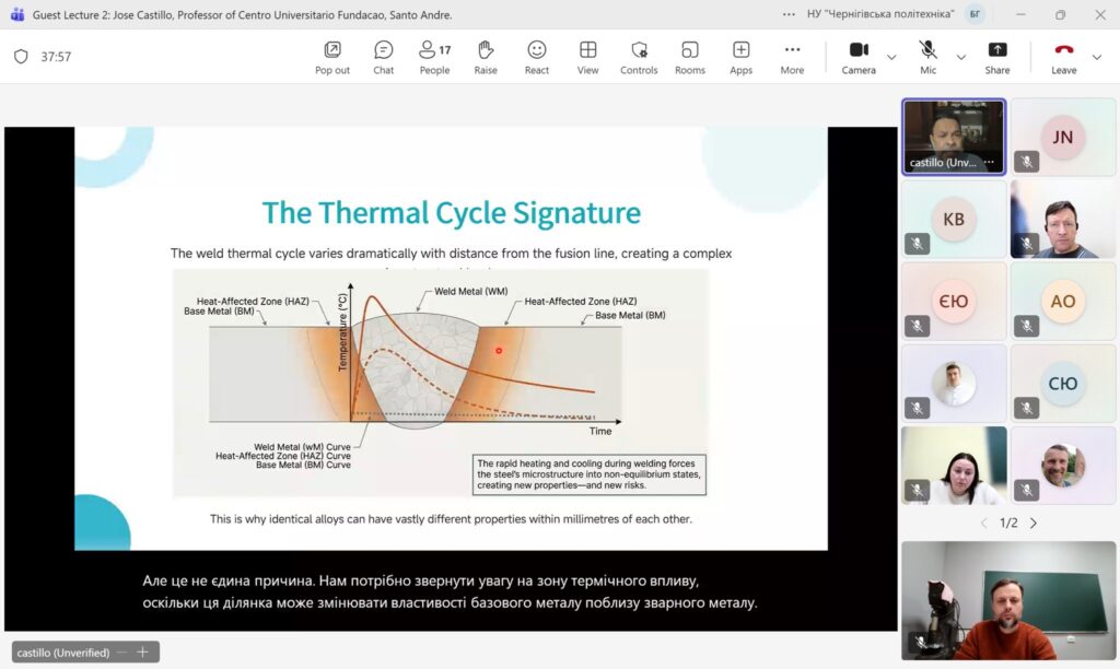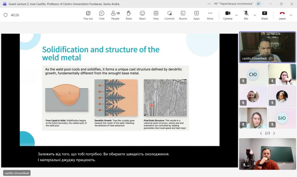 09 грудня 2025 року на кафедрі Технологій зварювання та будівництва Національного університету «Чернігівська політехніка» в онлайн форматі відбулася гостьова лекція професора університету Сан-Паулу, (Бразилія) Джозе Кастільо / Jose Castillo на тему: Welding Metallurgy: Why It Matters.
