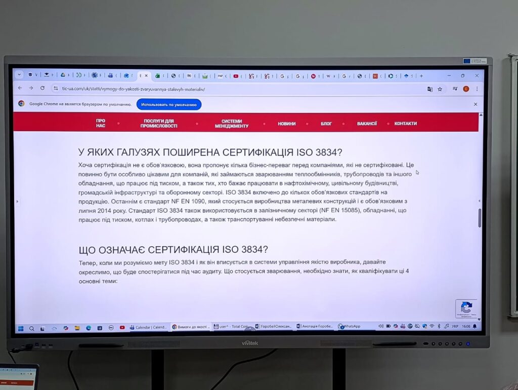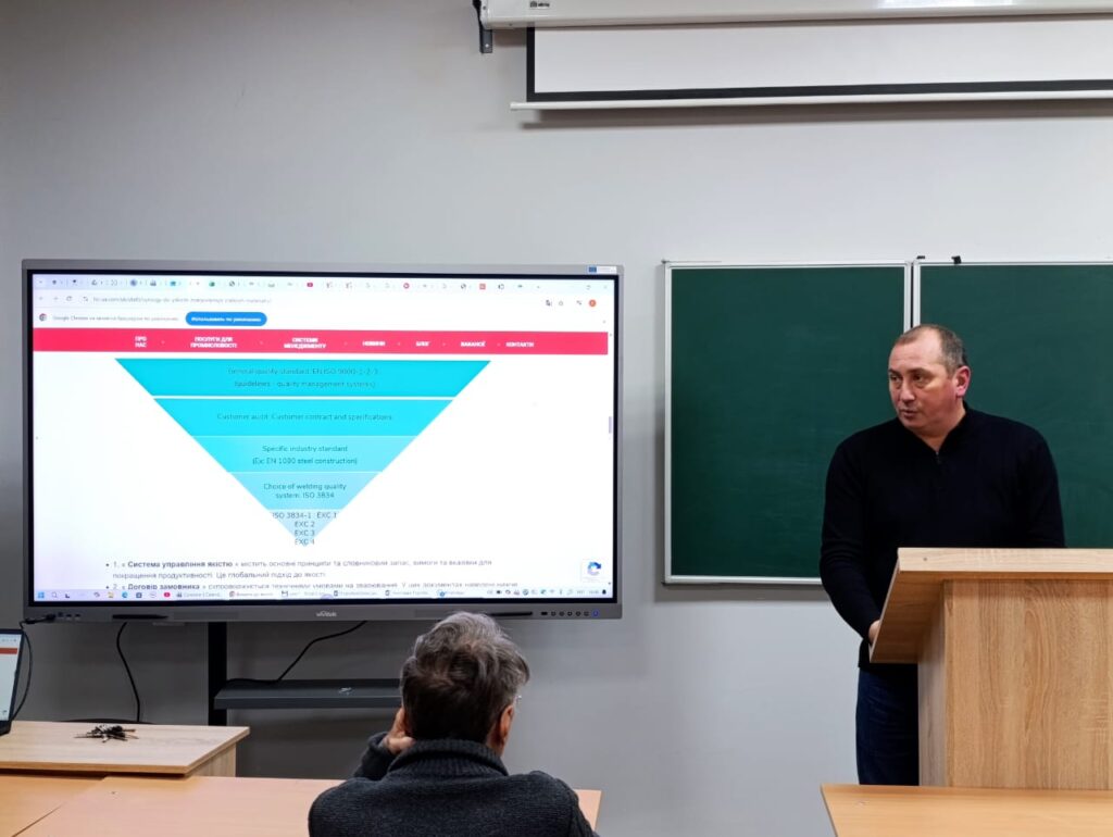 12 грудня 2025 року у рамках роботи Обласного форуму «Освіта – фундамент розвитку регіону», співорганізатором якого виступив Національний університет «Чернігівська політехніка», відбулось засідання проєктної групи освітньої програми «Технології та устаткування зварювання» другого (магістерського) рівня вищої освіти за спеціальністю G9 Прикладна механіка галузі знань G Інженерія, виробництво та будівництво. Спікерами засідання були керівник проєктної групи доцент кафедри технологій зварювання та будівництва Олексієнко Сергій Владиславович та член Ради роботодавців НУ «Чернігівська політехніка», директор з якості та загальних питань ТОВ «Український кардан» Верхулевський Олександр Іванович. На засіданні розглянули переваги сертифікації підприємств, які займаються зварюванням, за стандартом ISO 3834. Визначили, що система управління якістю зварювання, що відповідає стандарту ISO 3834, додає цінності продукції виробників, покращує можливості координаторів зварювання та термін дії сертифікатів зварників. Встановили необхідність розширення предметного поля викладання дисципліни «Інтегровані системи якості» за рахунок вивчення стандарту ISO 3834 з метою формування у здобувачів – майбутніх фахівців – знань та навичок визначення всіх факторів, які можуть вплинути на якість зварного продукту і які необхідно контролювати на всіх етапах, до, під час і після зварювання.