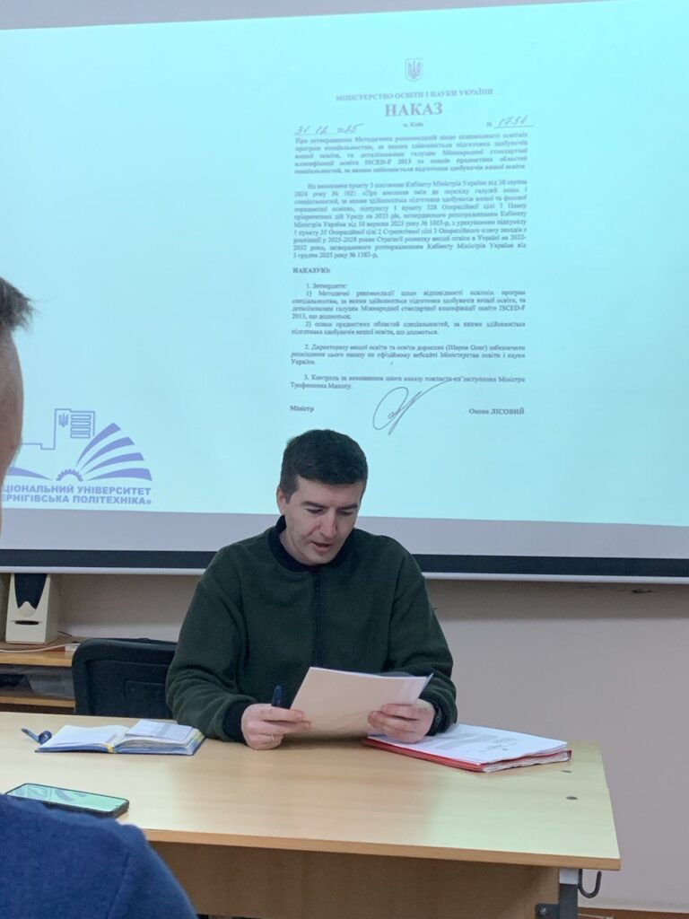 Одним із ключових питань порядку денного став розгляд наказу Міністерства освіти і науки України від 31.12.2025 р., яким затверджено Методичні рекомендації щодо відповідності освітніх програм спеціальностям, за якими здійснюється підготовка здобувачів вищої освіти, та деталізованим галузям Міжнародної стандартної класифікації освіти ISCED-F 2013, а також описів предметних областей спеціальностей.