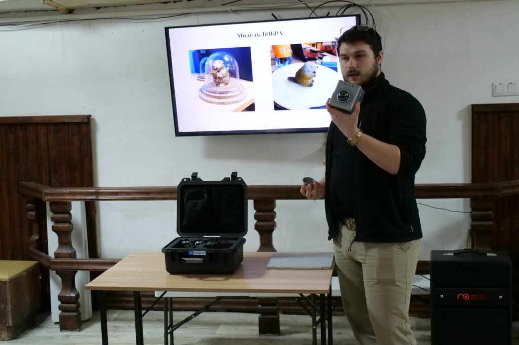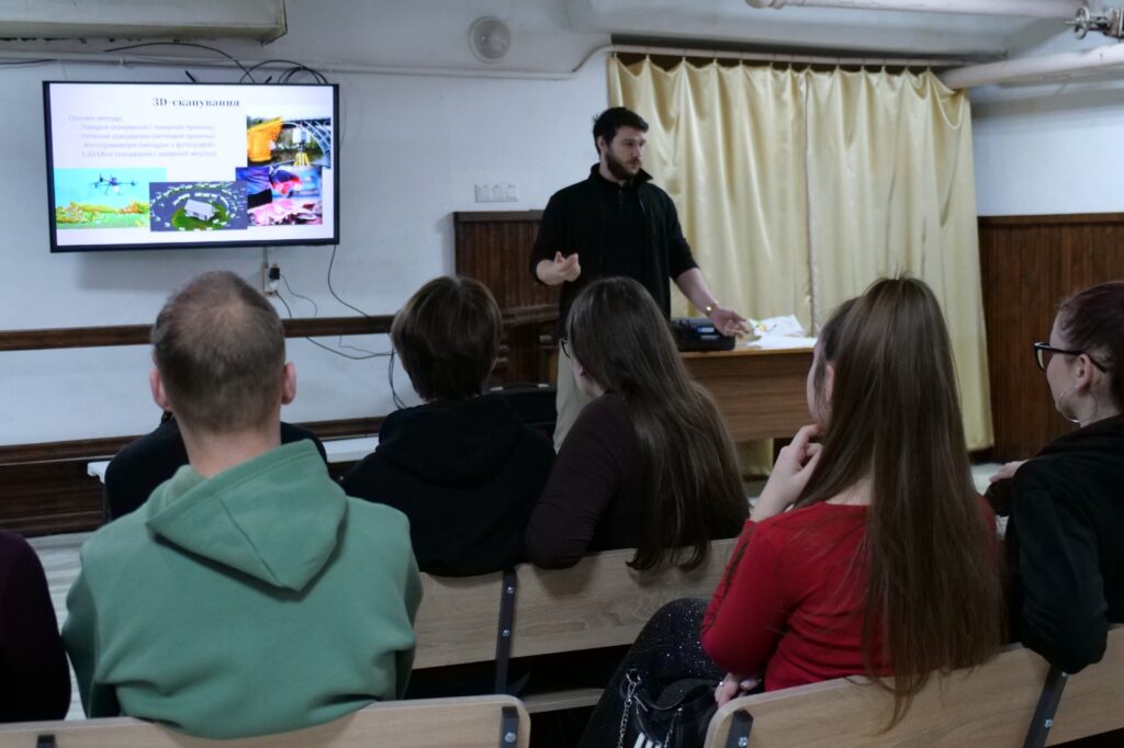 Далі найцікавіше – практична частина! Молодь змогла власноруч просканувати приміщення та побачити його у форматі 3D-моделі. Це дало можливість «доторкнутися» до сучасних технологій і зрозуміти, як вони працюють на практиці – ознайомитися з основними засадами технології 3D-сканування, роботи з хмарами точок та 3D-моделювання.
